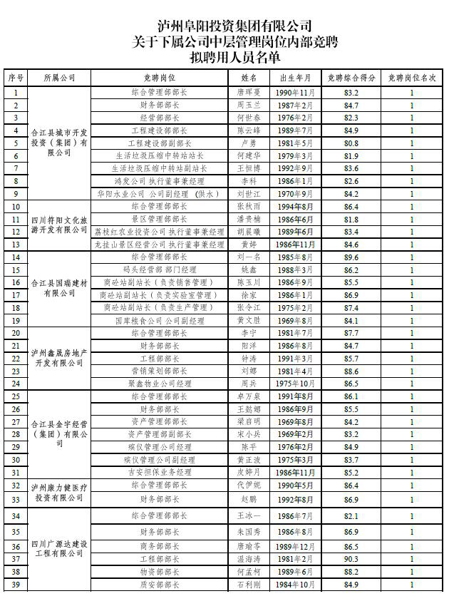 根據《瀘州阜陽投資集團有限公司關于下屬公司中層管理崗位內部競聘工作的公告》(瀘阜投發(fā)〔2020〕21號)的規(guī)定,經阜陽集團黨委會研究決定,擬聘用唐琿蔓等39人為瀘州阜陽投資集團有限公司下屬公司中層管理人員?,F面向社會公示7日,公示時間2020年6月19日至2020年6月25日。公示期間,如有問題,請及時向瀘州阜陽投資集團有限公司組織與人力資源管理部反映。要求舉報者署實名,實事求是地反映問題,并提供必要的調查線索。