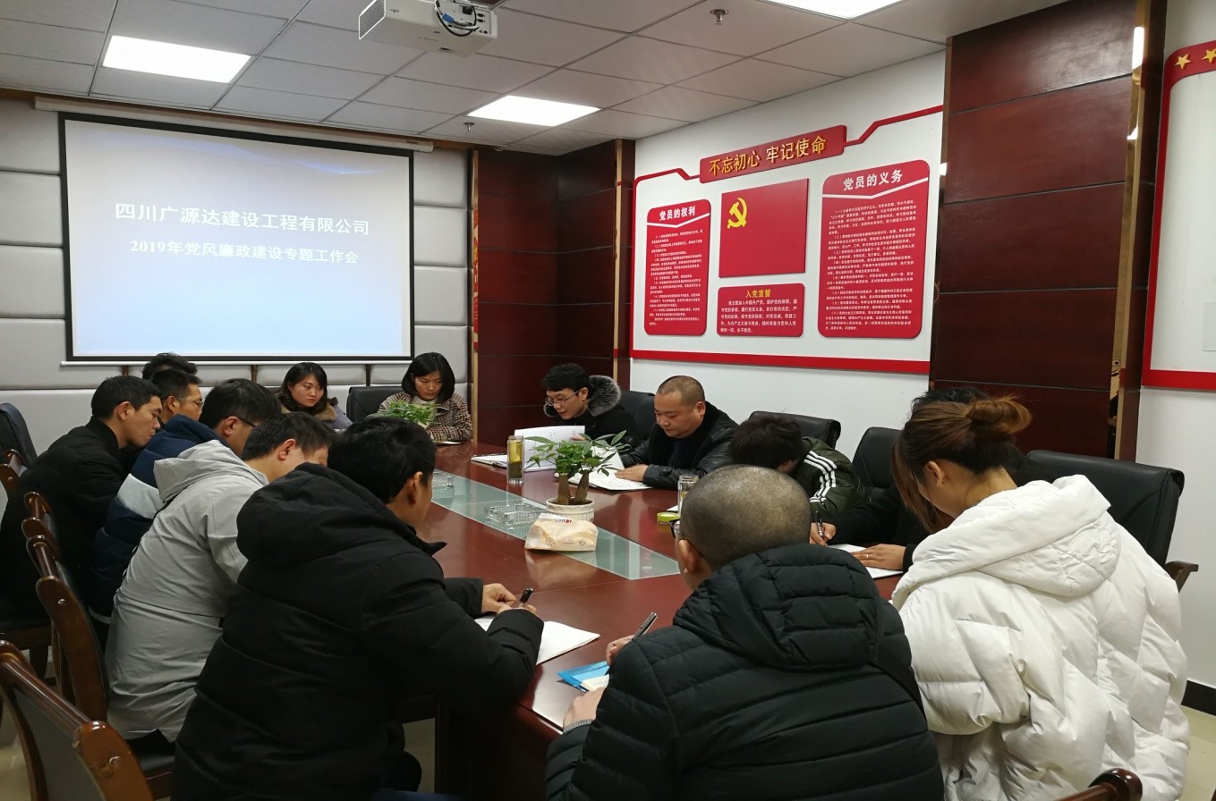 1月11日下午,四川廣源達(dá)建設(shè)工程有限公司組織召開(kāi)了2019年第一季度安全生產(chǎn)工作暨黨風(fēng)廉政建設(shè)工作會(huì)議。會(huì)上,董事長(zhǎng)譙棣升領(lǐng)學(xué)了安全生產(chǎn)工作相關(guān)文件,全面總結(jié)了2018年安全生產(chǎn)工作目標(biāo)完成情況,并對(duì)2019年公司的安全生產(chǎn)工作提出了要求。同時(shí),董事長(zhǎng)譙棣升還著重強(qiáng)調(diào)了廉潔從業(yè)相關(guān)事宜,要求抓黨風(fēng)廉政建設(shè)要像抓企業(yè)安全生產(chǎn)一樣持之以恒,與企業(yè)經(jīng)營(yíng)發(fā)展同頻共振;把廉潔從業(yè)作為企業(yè)發(fā)展的出發(fā)點(diǎn),堅(jiān)持以廉潔凝聚人心,以廉潔樹(shù)立形象。