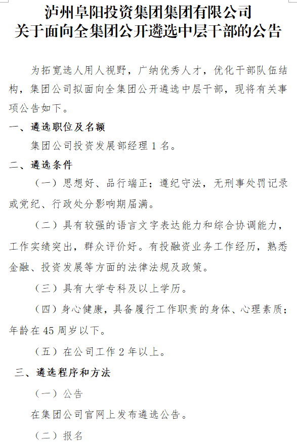 瀘州阜陽投資集團集團有限公司關(guān)于面向全集團公開遴選中層干部的公告