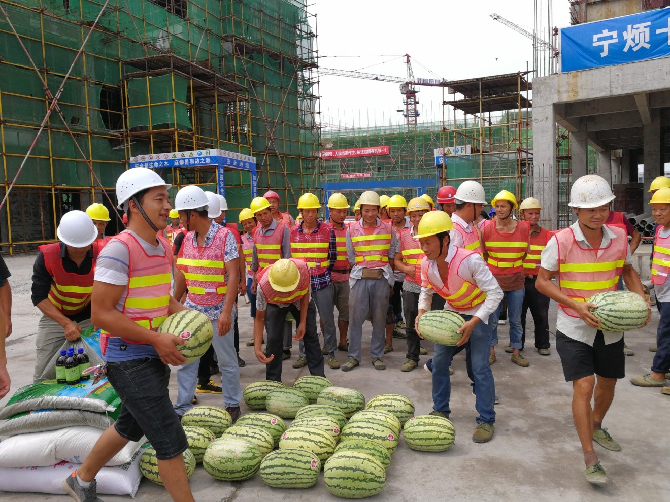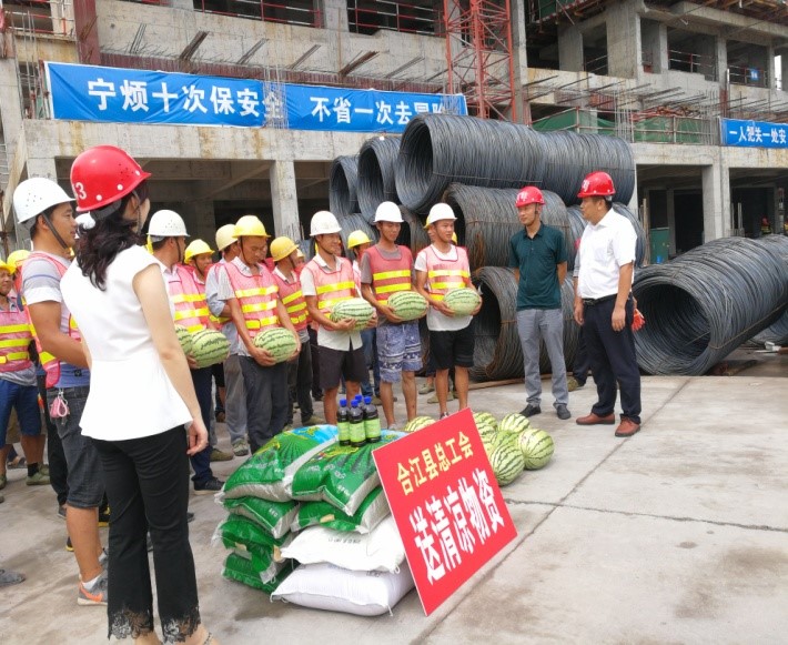 2019年8月5日下午,縣總工會會同城投公司、鑫晟公司、廣源達(dá)公司到鑫晟學(xué)府項(xiàng)目開展送“清涼”活動(dòng)??h工會領(lǐng)導(dǎo)一行對建筑工人表示慰問,并為他們送上藿香正氣液、風(fēng)油精、西瓜、綠豆、白糖等降暑防暑物品。